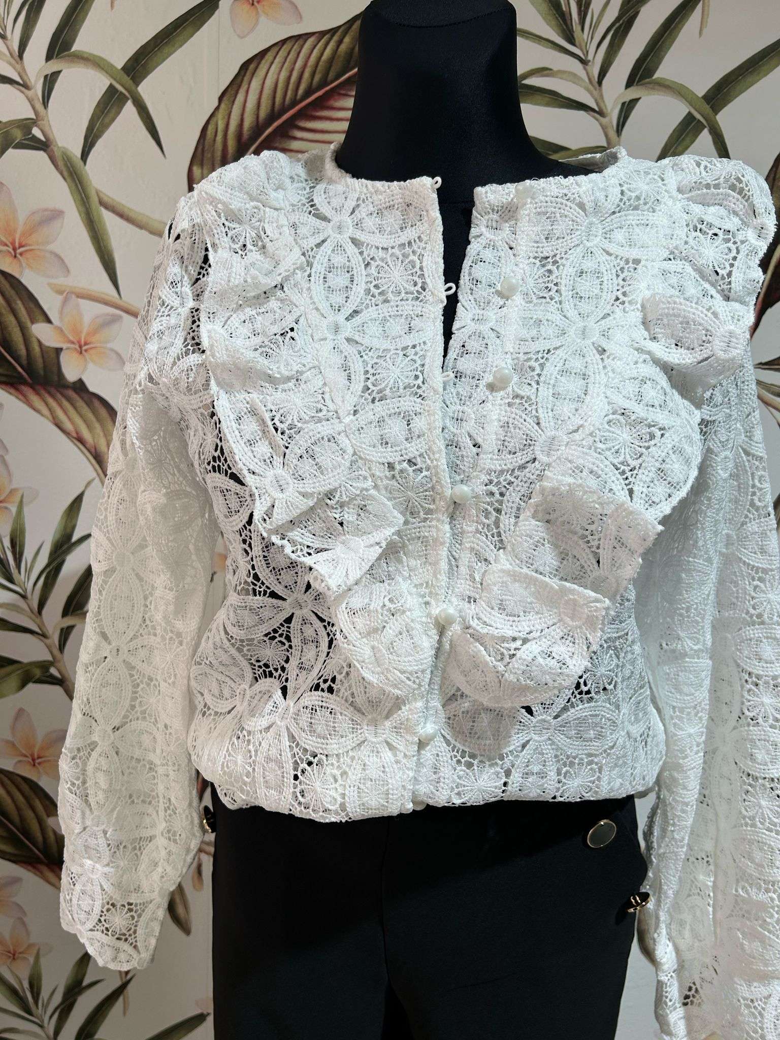 Elegante y femenina, esta blusa de encaje blanco es perfecta para cualquier ocasión. Su diseño con volantes y botones frontales aporta un toque romántico y sofisticado. Ideal para combinar con jeans o faldas y crear looks únicos. Talla única, adaptable y cómoda.
