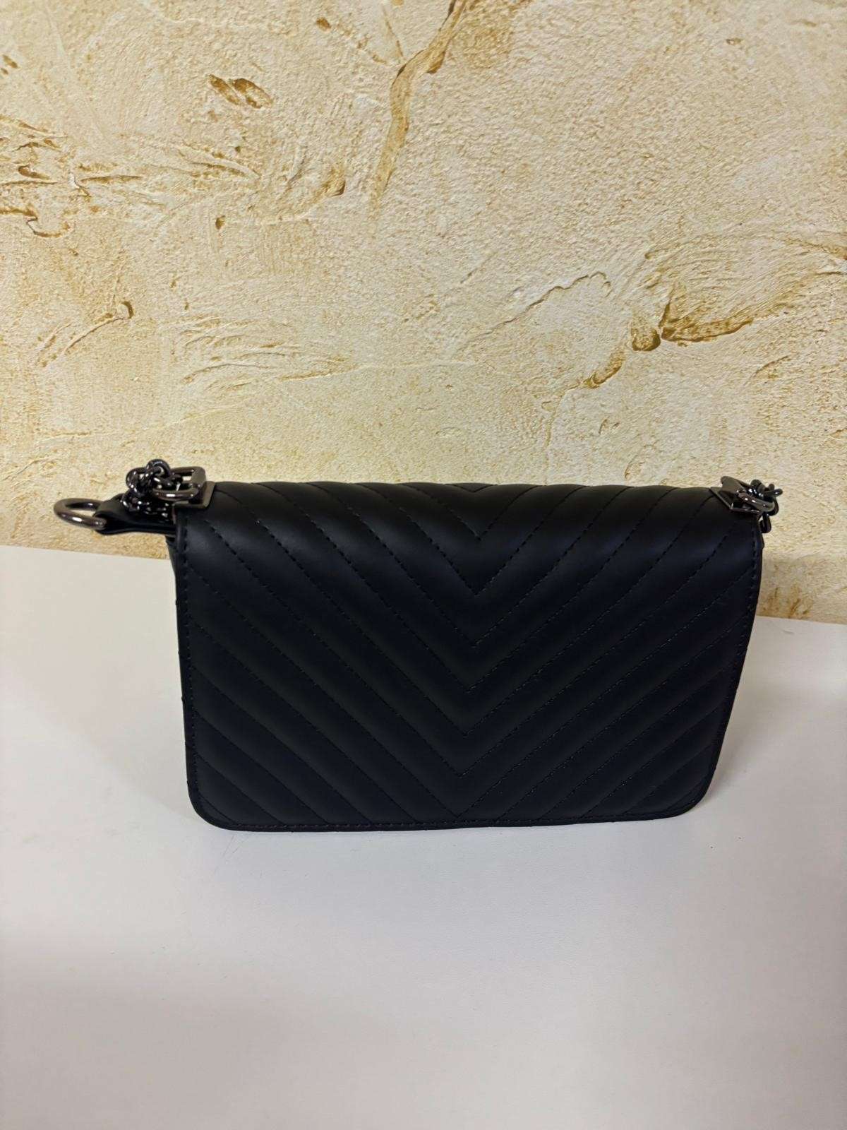 Elegante bolso acolchado disponible en colores negro y camel, con diseño de patrón en forma de V y detalles de cadena. Ideal para añadir un toque sofisticado y moderno a cualquier look. Su tamaño compacto y su estilo versátil lo hacen perfecto para cualquier ocasión, tanto casual como formal.