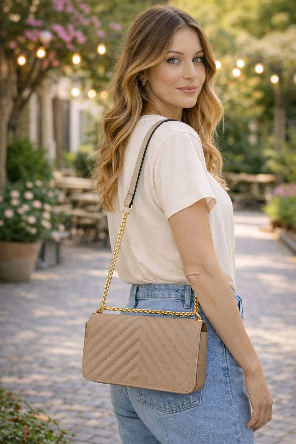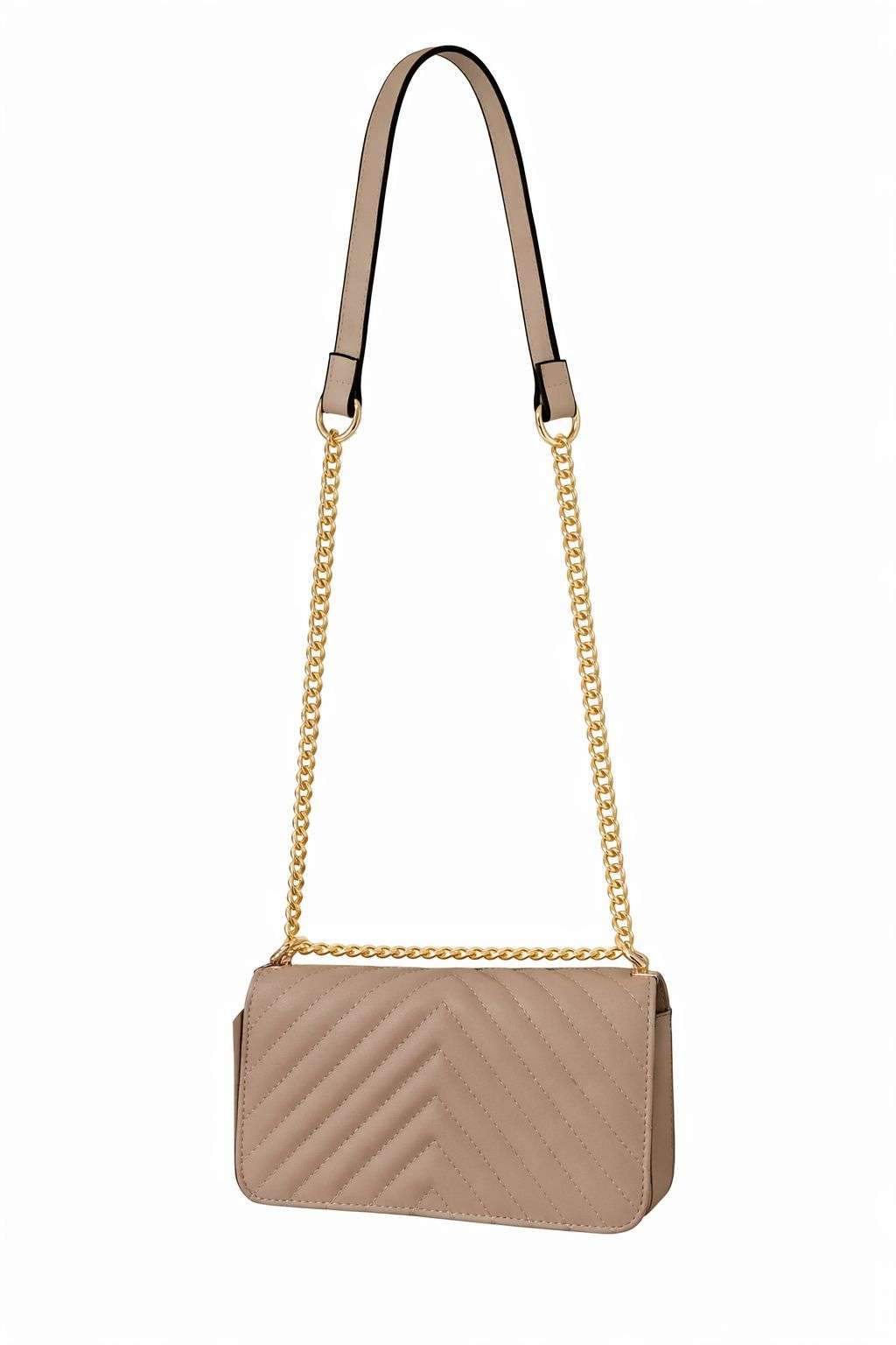 Bolso de hombro en tono beige con diseño acolchado en zigzag y cadena dorada. Elegante, ligero y perfecto para acompañar tus looks diarios o de ocasión con un toque sofisticado.