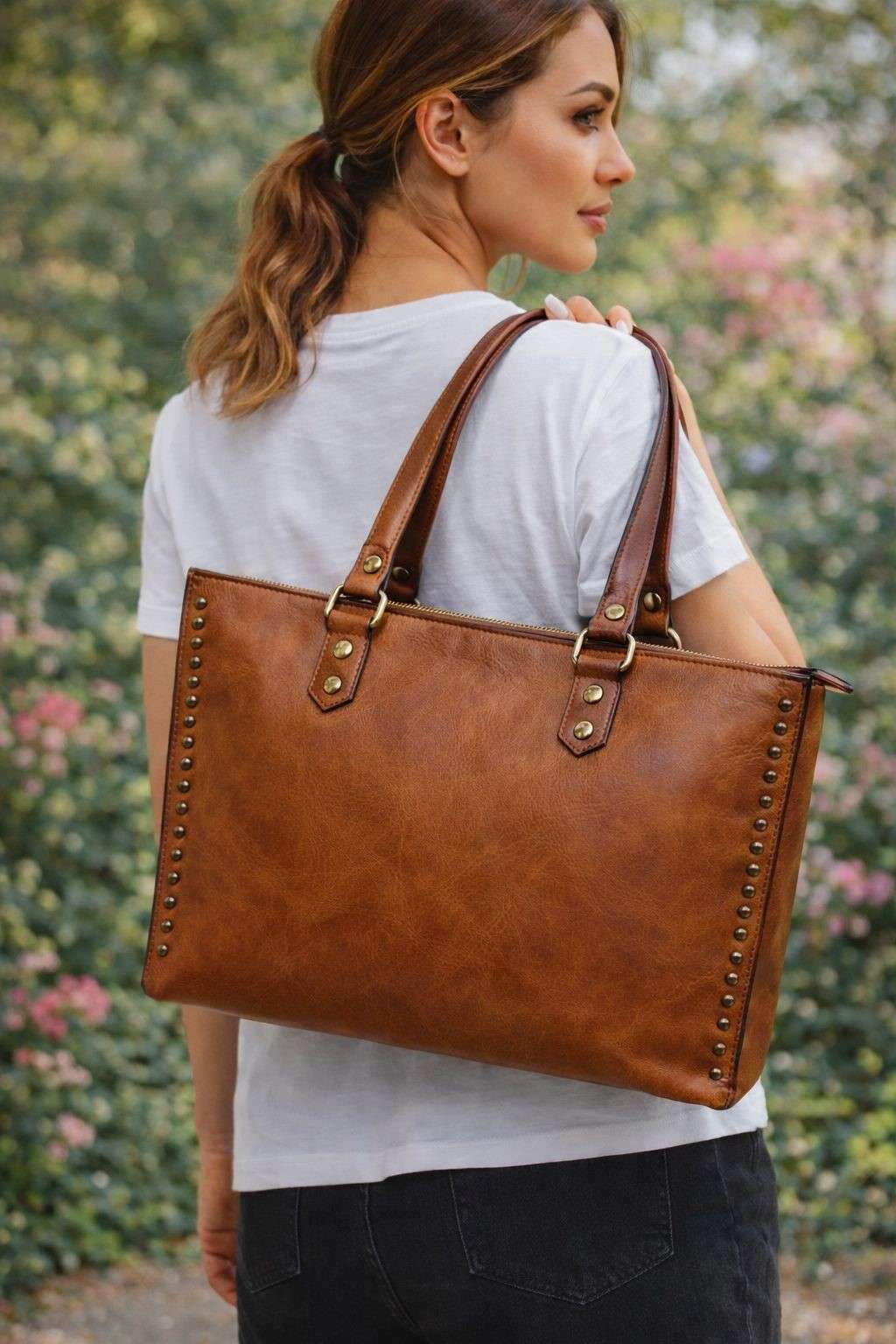 Bolso tote amplio en tono cuero marrón, con acabado elegante y detalles metálicos que aportan carácter. Asas resistentes y diseño funcional, ideal para el día a día con un estilo clásico y atemporal.