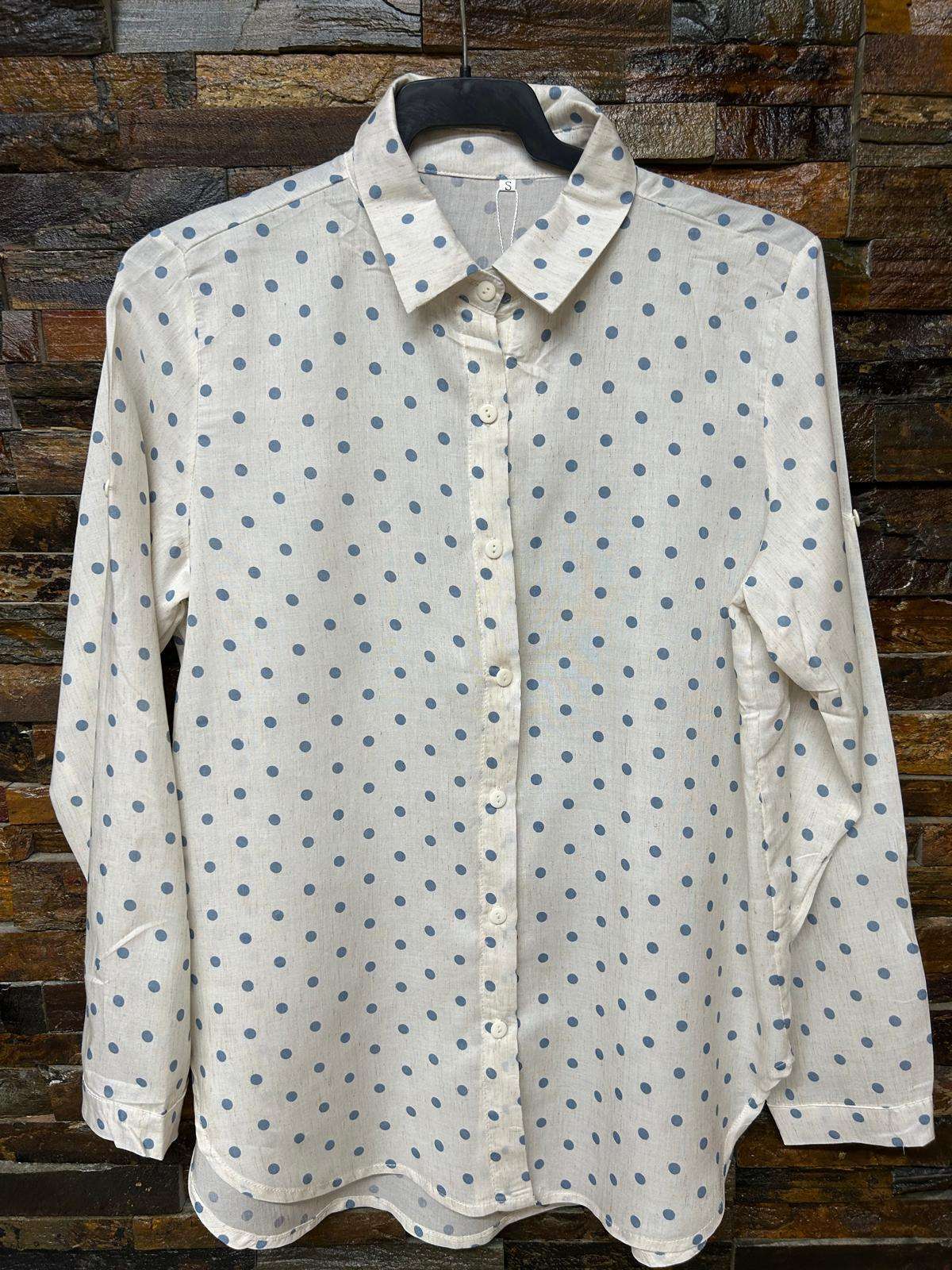 Un clásico reinventado. Esta camisa de fondo beige con lunares azules aporta un toque sofisticado y versátil a cualquier look. Su tejido ligero y corte cómodo la hacen ideal para el día a día. Perfecta para combinar con jeans o pantalones de vestir. Disponible en tallas S a XXL para un ajuste perfecto.