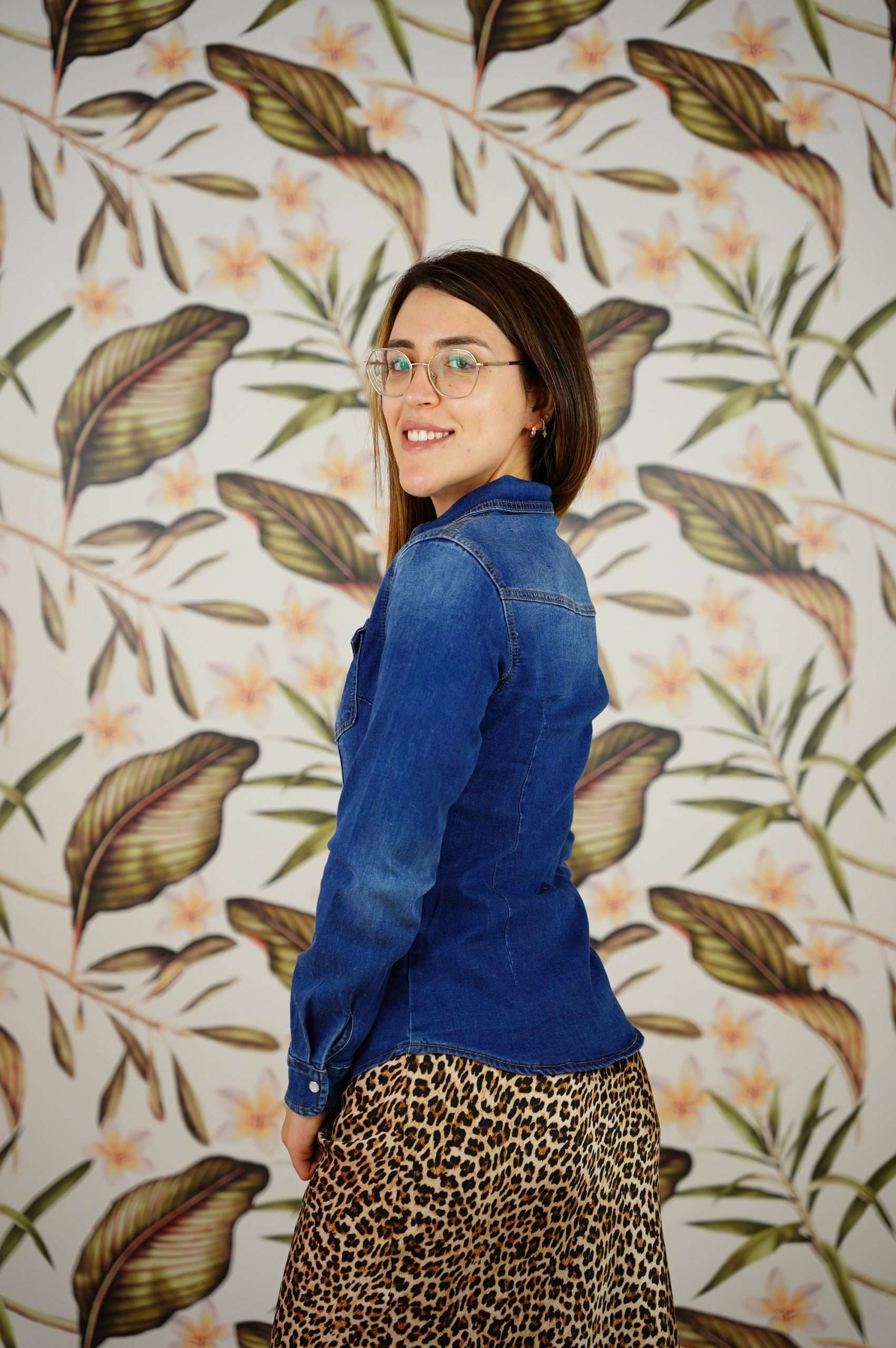 Camisa Vaquera elástica. Loa botones son brillantes.