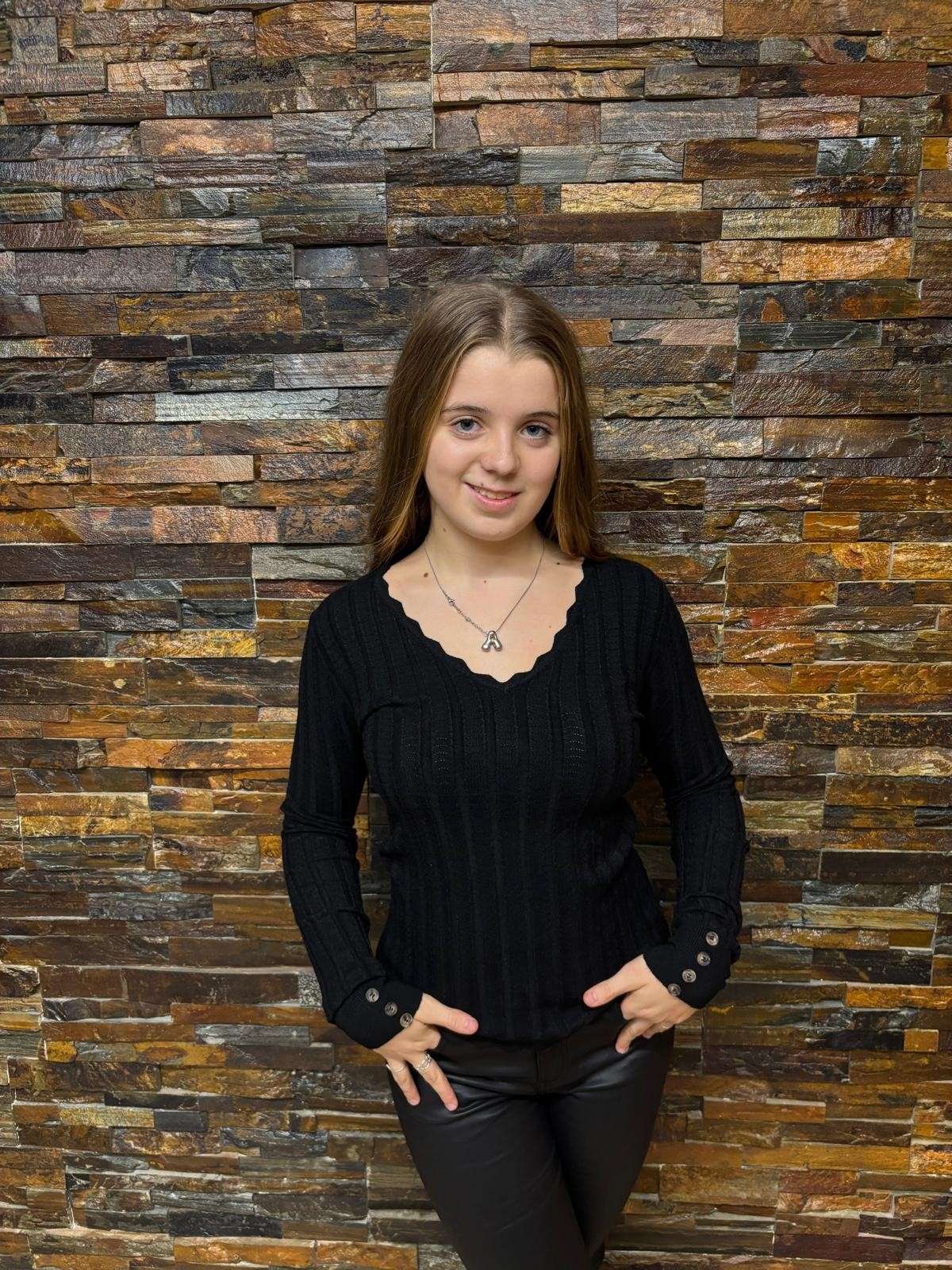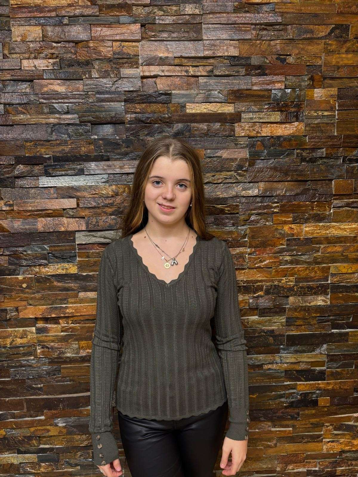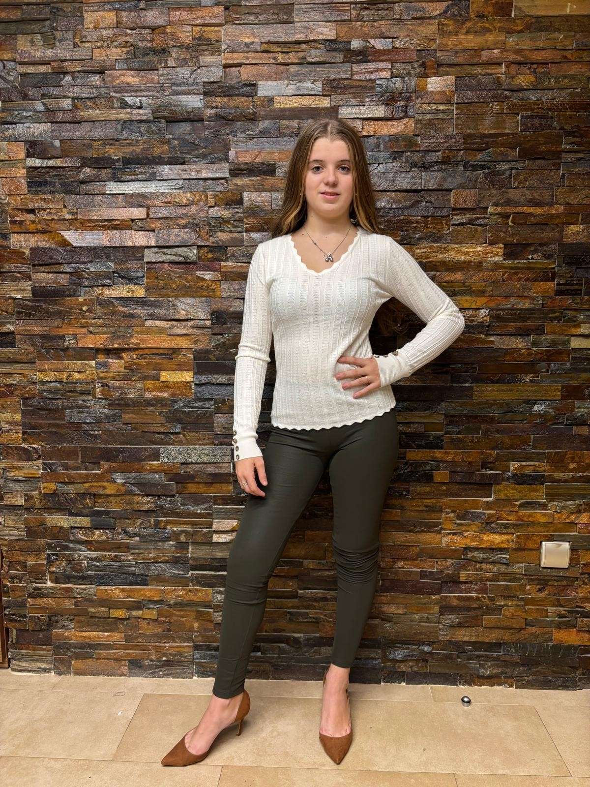 Esta camiseta básica de punto tiene un elegante cuello en V con detalles ondulados, que le aportan un toque distintivo. Las mangas largas cuentan con botones decorativos en los puños, lo cual añade un extra de estilo al diseño. Está disponible en varios colores: beige, gris, negro y verde, para combinar fácilmente con diferentes estilos y ocasiones.