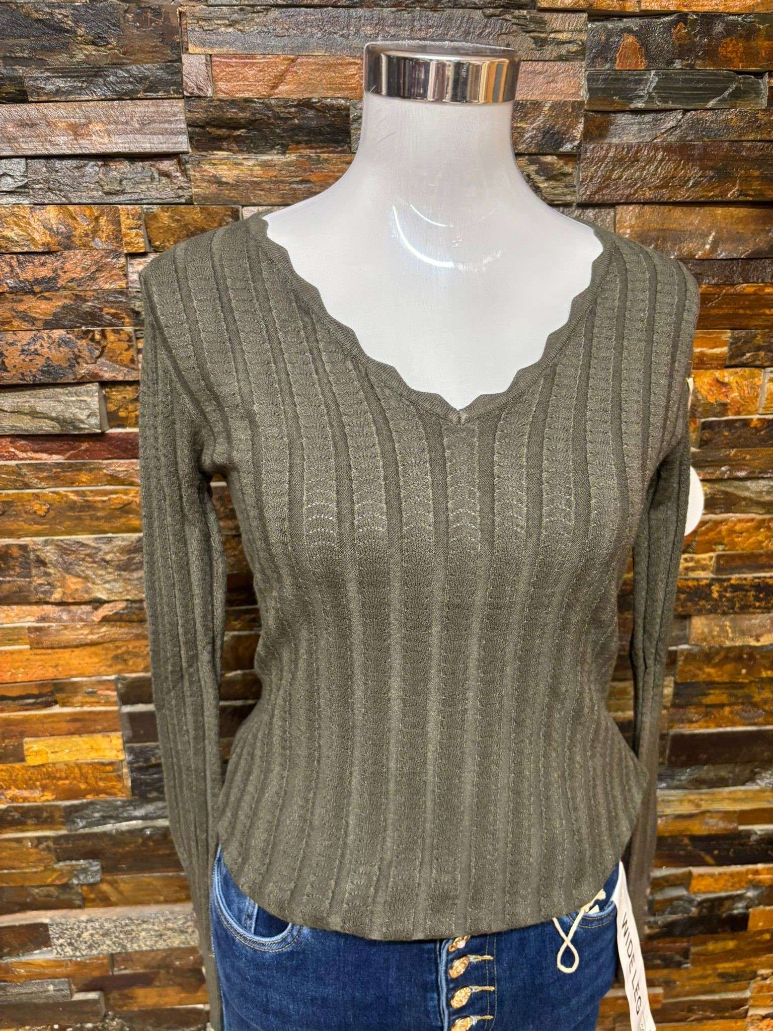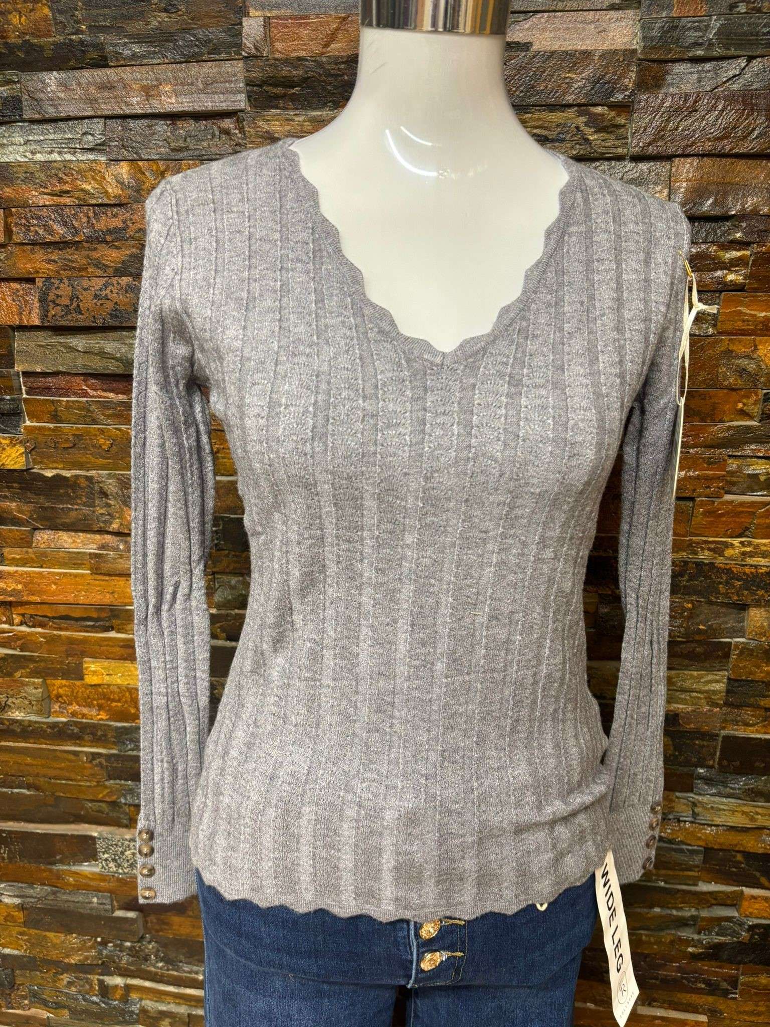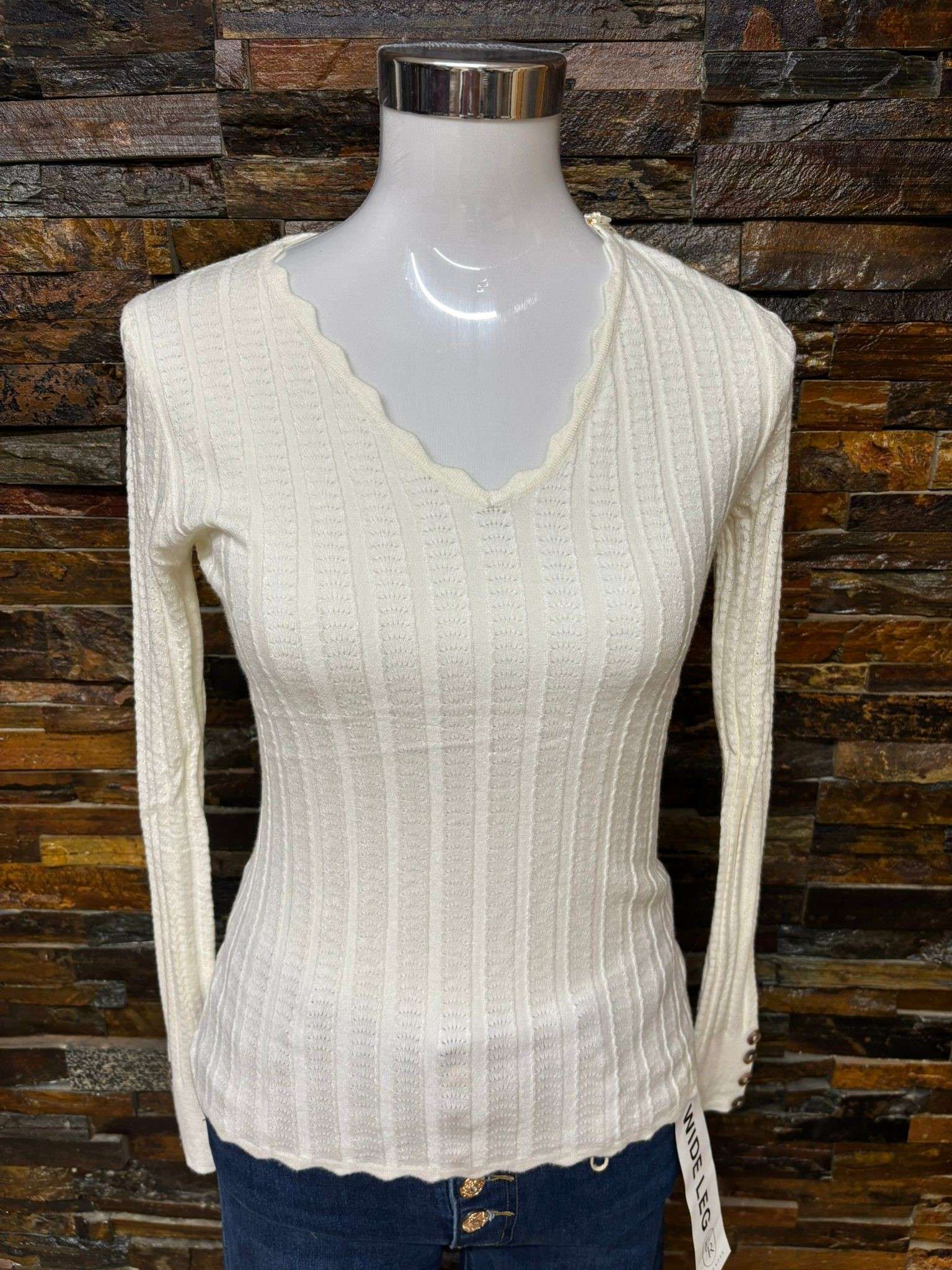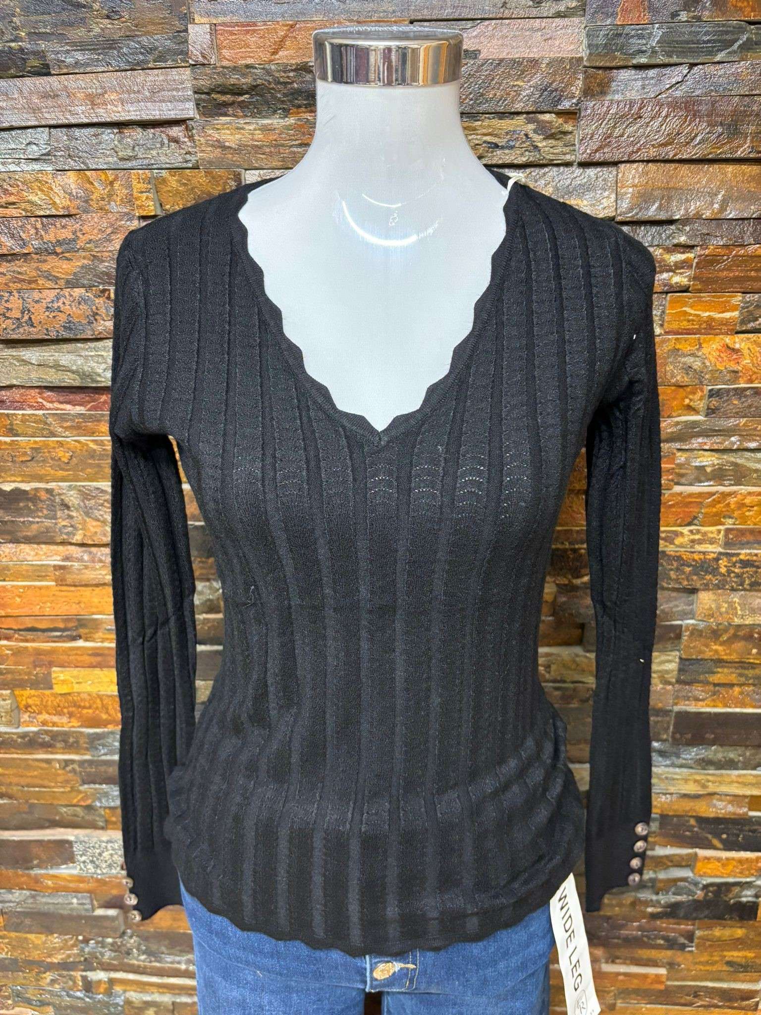Esta camiseta básica de punto tiene un elegante cuello en V con detalles ondulados, que le aportan un toque distintivo. Las mangas largas cuentan con botones decorativos en los puños, lo cual añade un extra de estilo al diseño. Está disponible en varios colores: beige, gris, negro y verde, para combinar fácilmente con diferentes estilos y ocasiones.