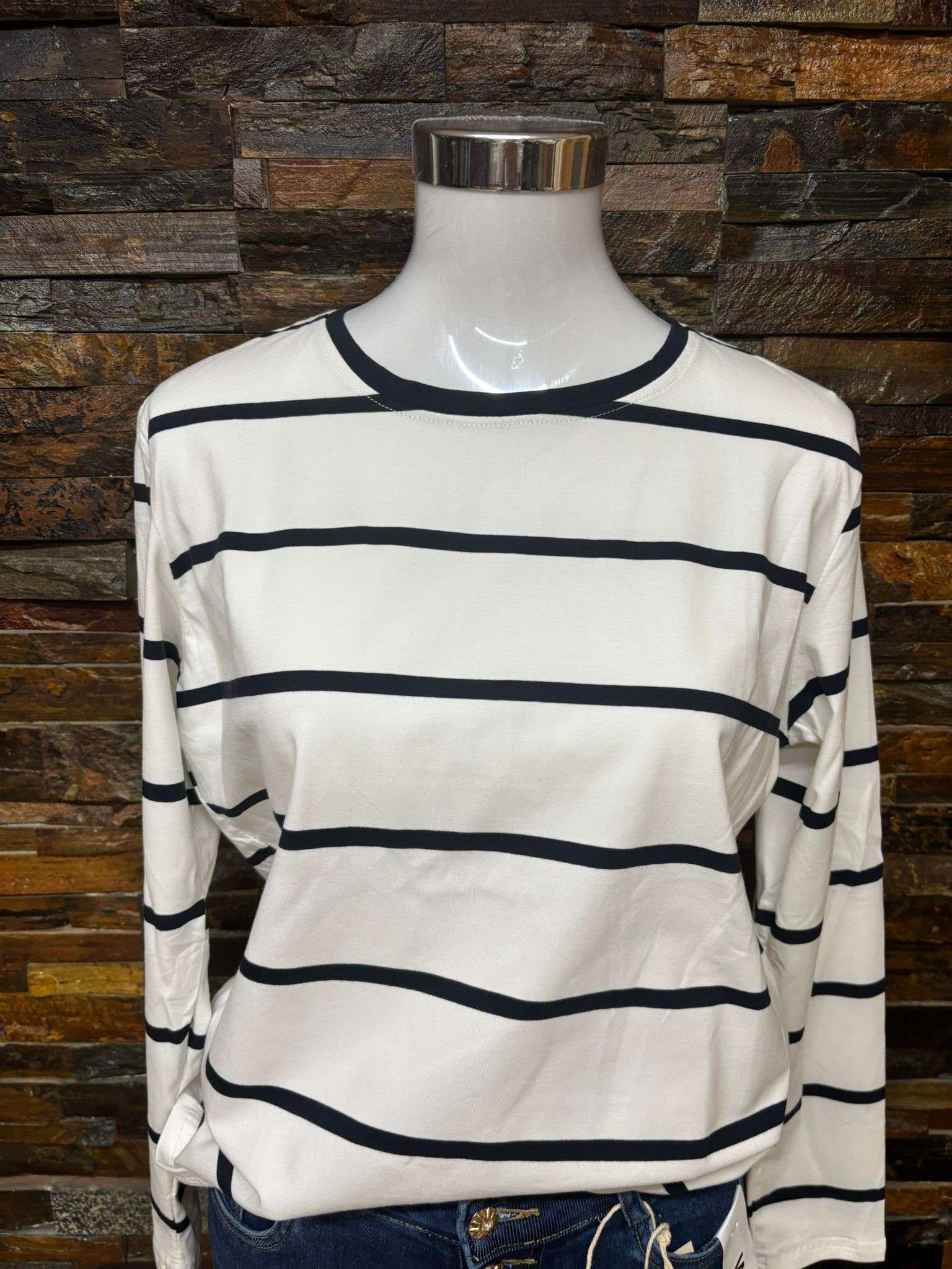 Camiseta de rayas de manga larga disponible en dos colores clásicos: blanco con rayas negras y negro con rayas blancas. Ideal para cualquier temporada, es cómoda y versátil, perfecta para combinar con cualquier look casual. Disponible en tallas desde la S hasta la XL.