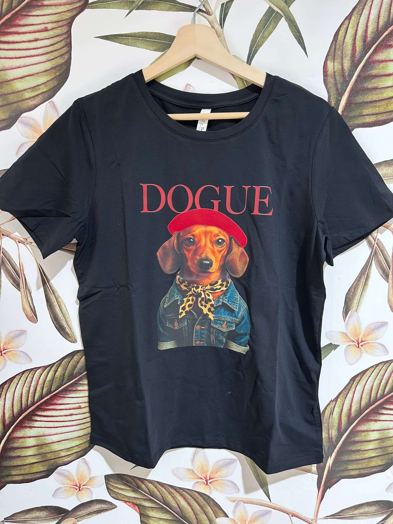 Camiseta de talla única en color negro con estampado frontal DOGUE. El diseño muestra a un perrito fashionista con boina roja, pañuelo animal print y chaqueta de mezclilla, logrando un estilo original que mezcla moda y humor. Perfecta para un look urbano, cómodo y juvenil, fácil de combinar con jeans, shorts o faldas para darle onda a cualquier outfit.