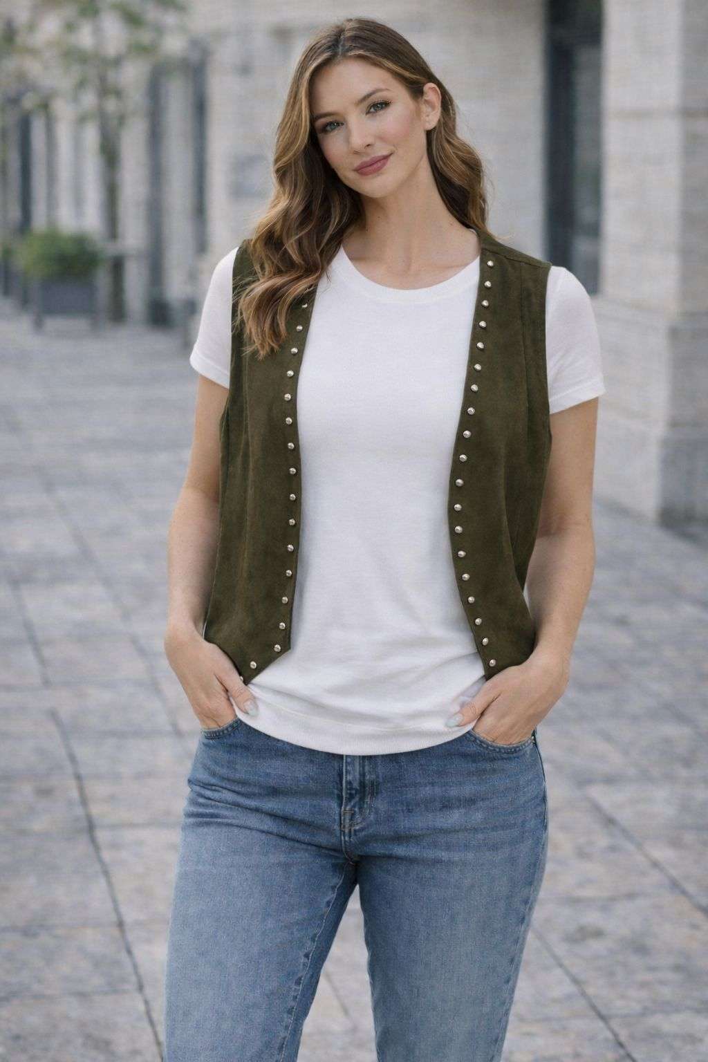 Chaleco en color verde con detalle de tachuelas metálicas en el frontal. De corte recto y tejido suave, es perfecto para completar tus looks con un toque moderno y diferente. Ideal para combinar con camisetas básicas y vaqueros.