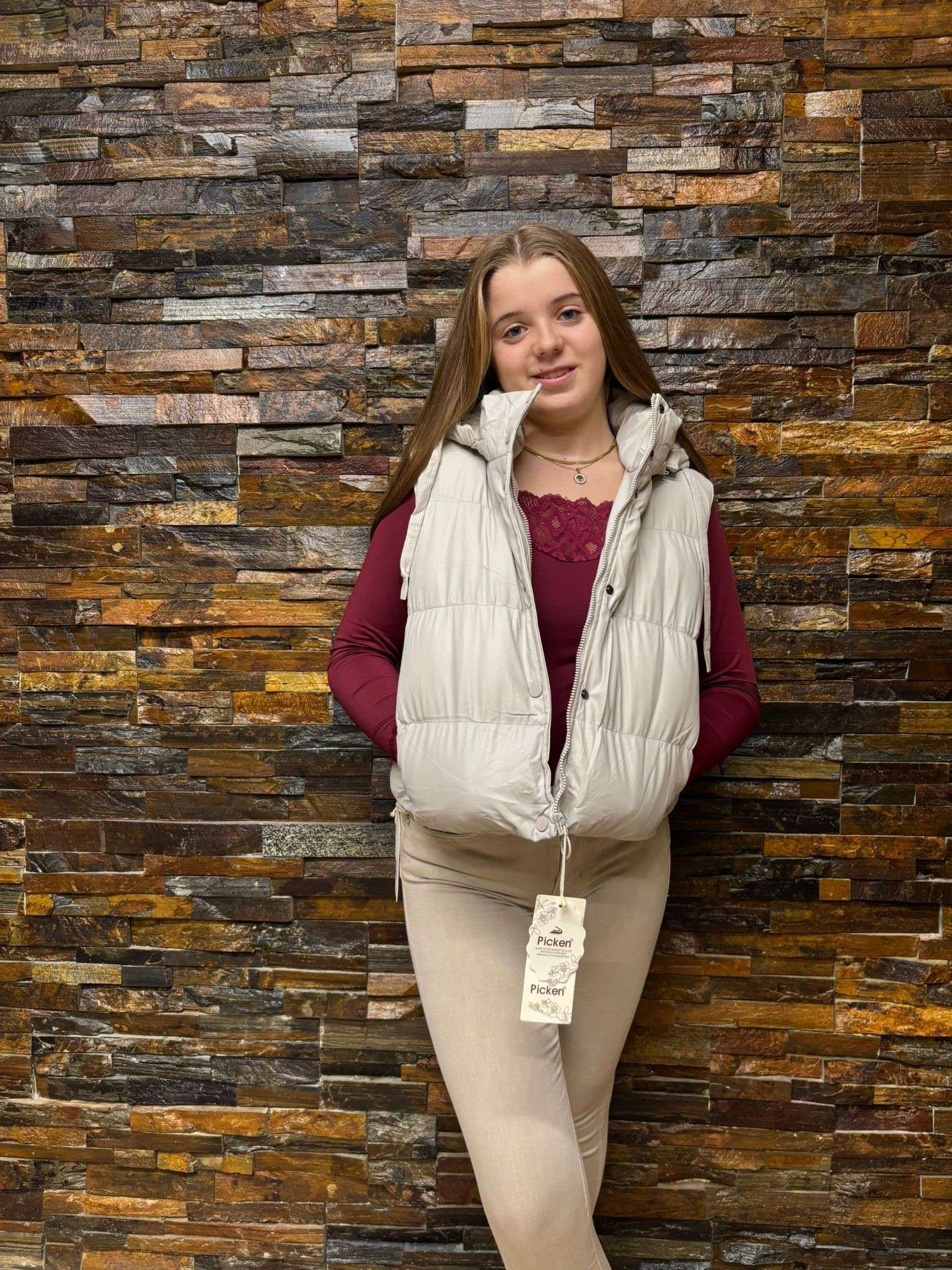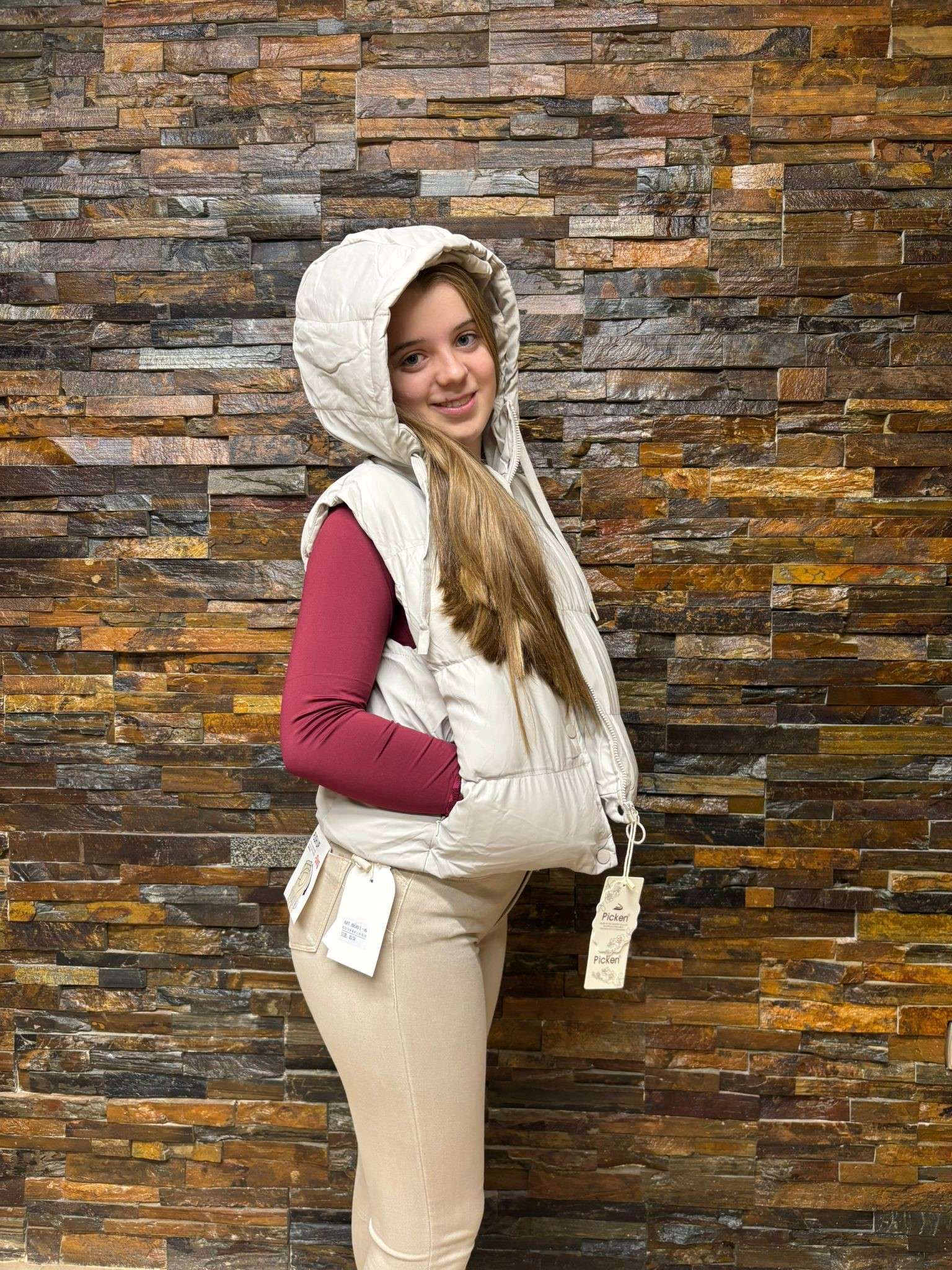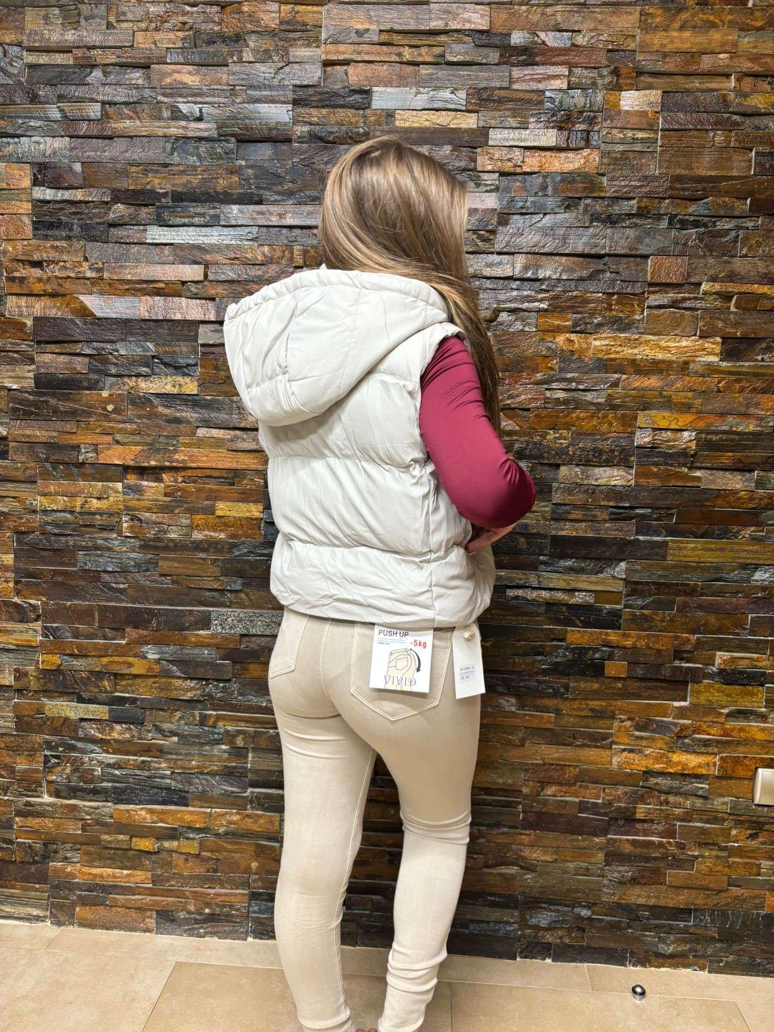Chaleco acolchado en color marfil, con capucha y diseño moderno que ofrece comodidad y estilo. Ideal para combinar con prendas casuales y mantenerte abrigado en días frescos.