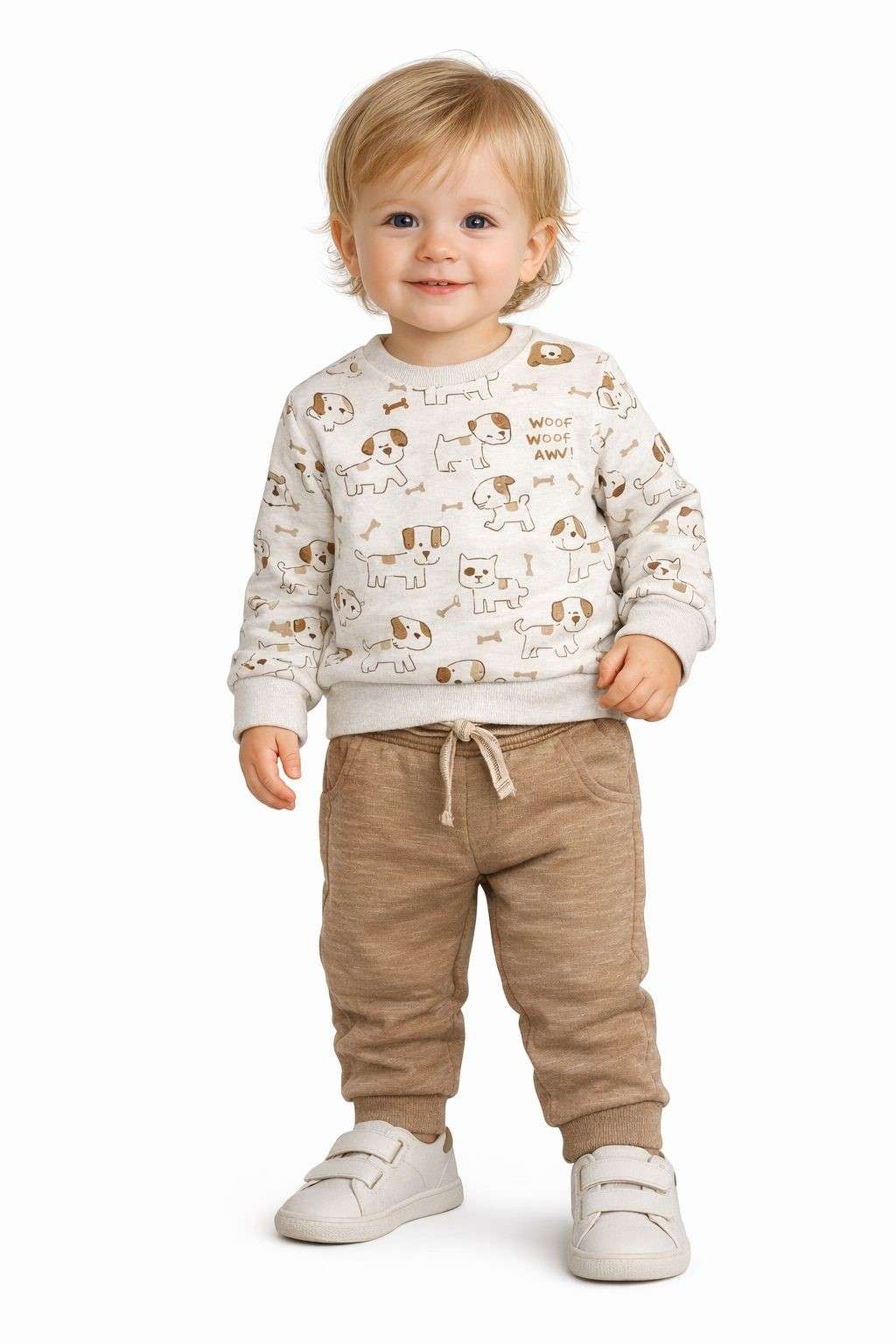 Conjunto de bebé niño compuesto por sudadera crema con estampado de perritos y pantalón jogger color camel.