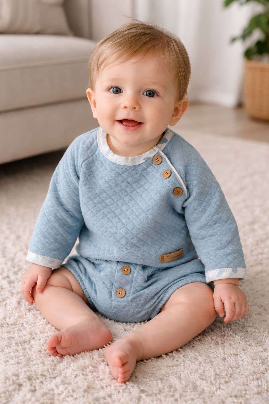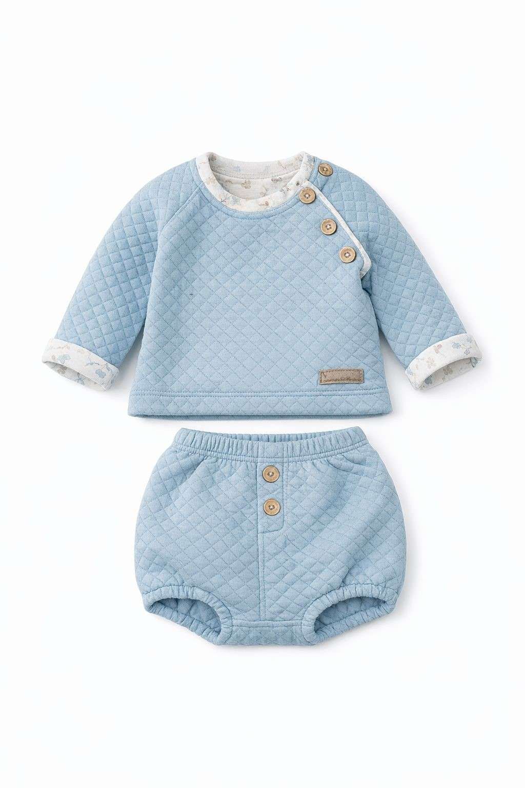 Conjunto de bebé en azul suave compuesto por sudadera acolchada con botones decorativos y cubrepañal a juego. Cómodo, cálido y perfecto para otoño e invierno, ideal para un look dulce y elegante en el día a día.