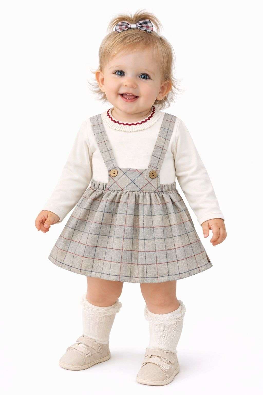 Elegante conjunto para bebé niña compuesto por camiseta de manga larga con cuello volante y vestido peto de cuadros con tirantes y botones decorativos. Diseño clásico, cómodo y perfecto para otoño e invierno.