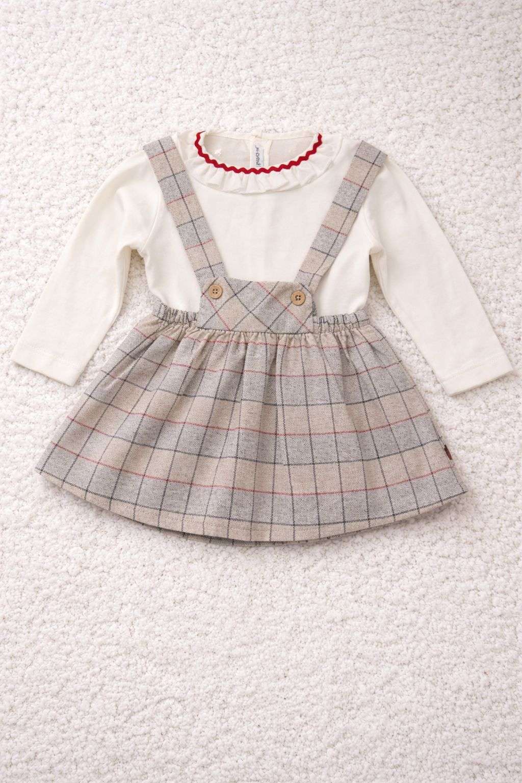 Encantador conjunto para bebé niña compuesto por camiseta de manga larga con cuello volante y vestido peto de cuadros en tonos neutros con detalles en rojo. Un look clásico y elegante, ideal para otoño e invierno.