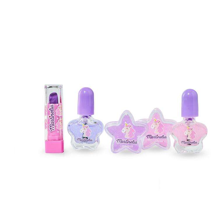 Contiene dos esmaltes de uñas con purpurina, dos bálsamos labiales también con purpurina y dos pintalabios. ¡Imposible resistirse!