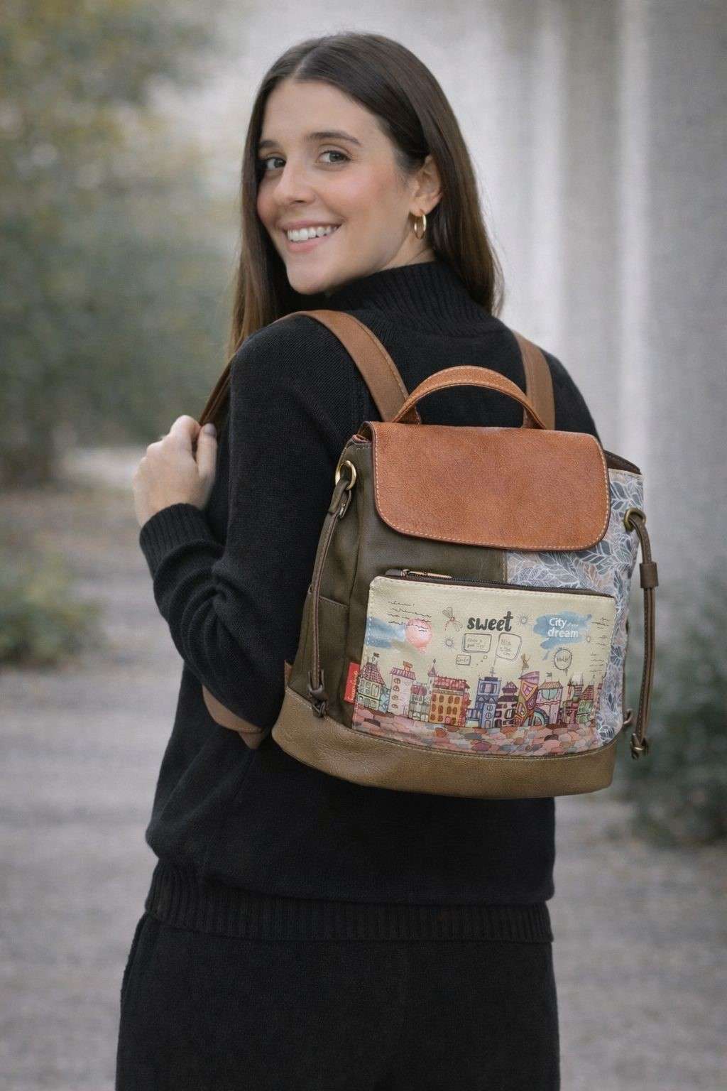 Mochila de diseño original y femenino, con ilustraciones artísticas que aportan un toque único y especial. Fabricada en material resistente con detalles efecto piel, cuenta con varios compartimentos para mantener todo organizado. Cómoda, práctica y perfecta para el día a día sin renunciar al estilo.
