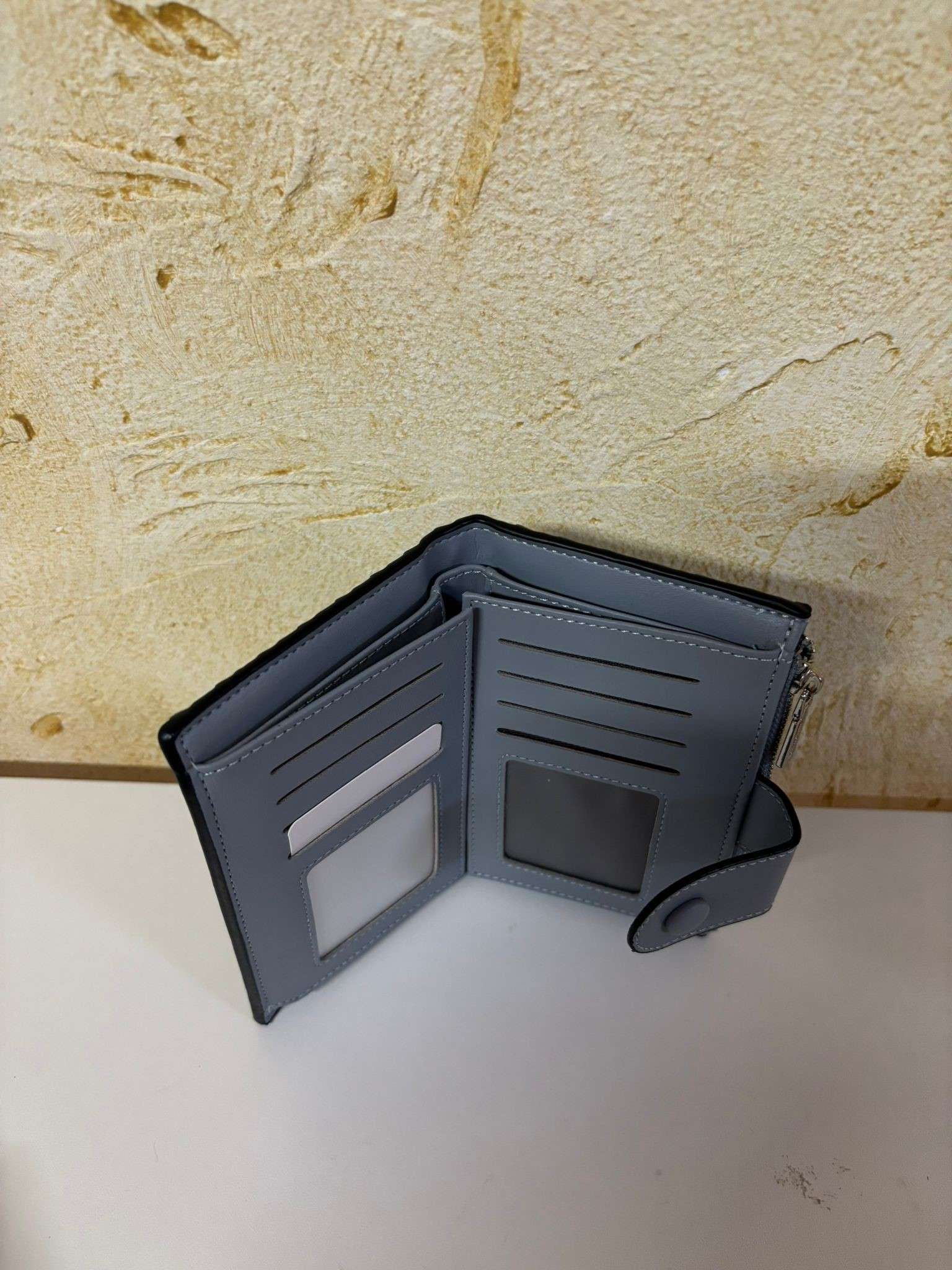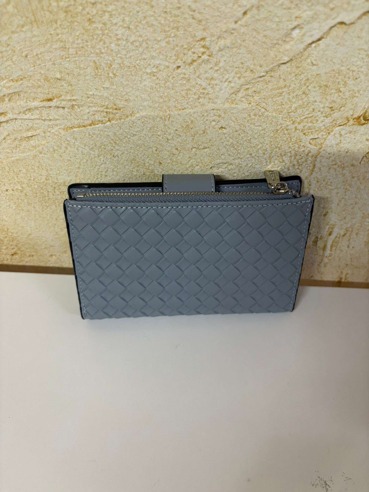Este billetero trenzado está disponible en un elegante tono azul, con un diseño práctico que incluye compartimentos para tarjetas y un cierre de botón seguro. Ideal para combinar estilo y funcionalidad.