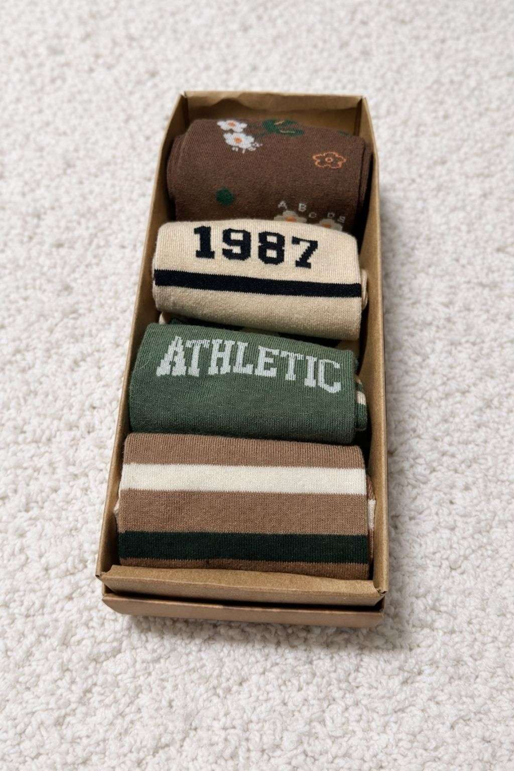 Descubre nuestro pack de 4 calcetines unisex con diseño vintage y estilo retro, perfectos para completar cualquier outfit con personalidad. Este set incluye modelos variados con estampados de rayas, floral y tipografía “athletic”, ideales para looks casual, streetwear y moda urbana.