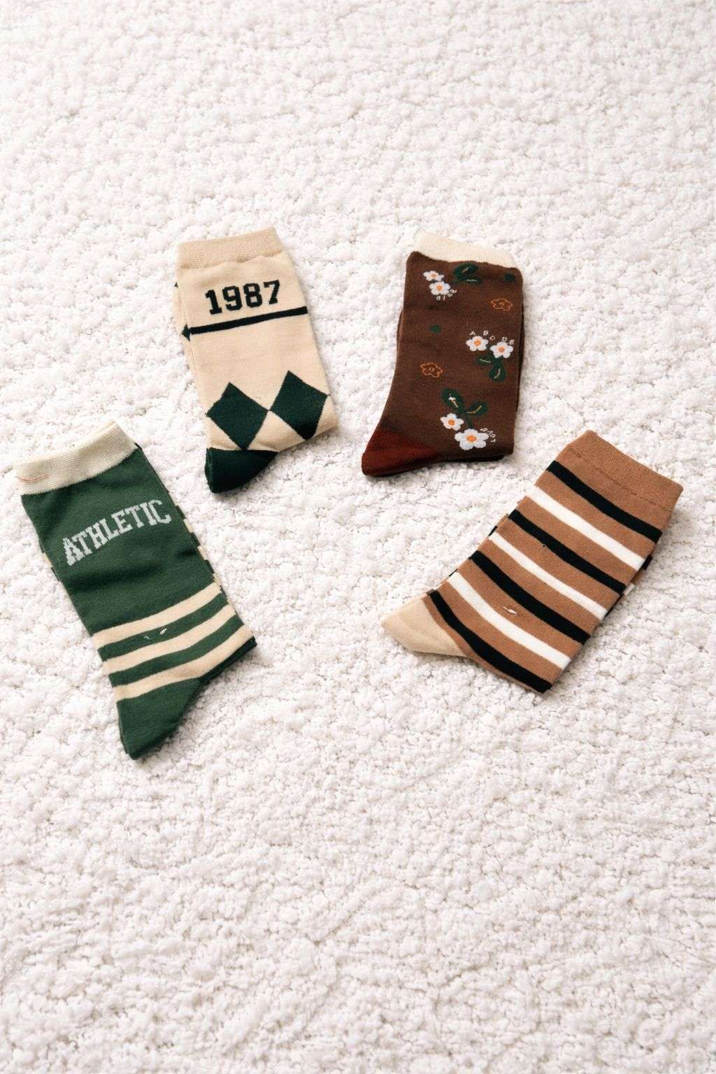 Pack de 4 calcetines unisex con diseño vintage y estilo retro. Incluye estampados de rayas, floral y athletic. Talla única, cómodos y perfectos para looks casual y streetwear.