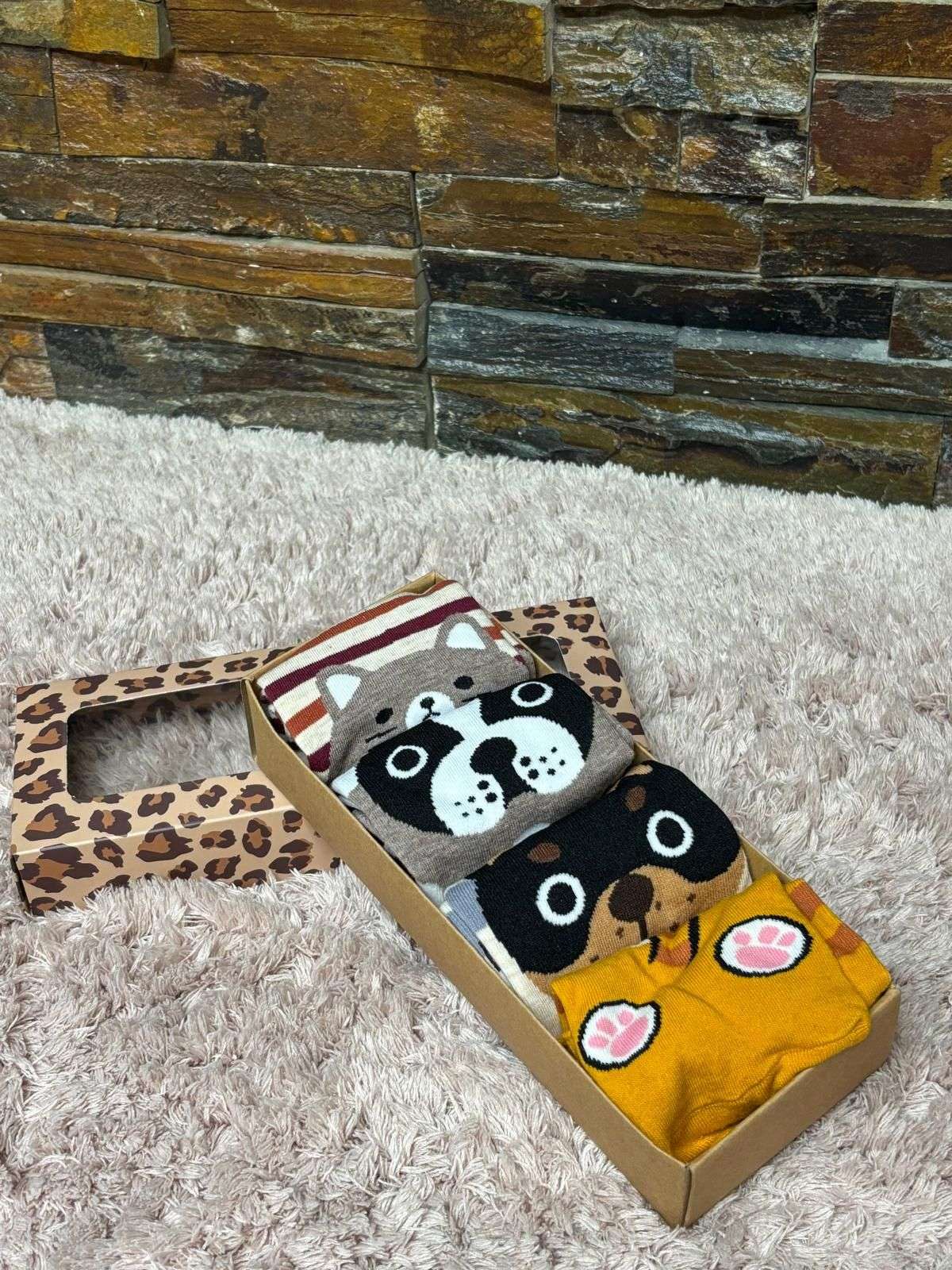 Caja con 4 pares de calcetines de algodón con adorables diseños de perritos. Una opción ideal para regalar y alegrar el día a quien más quieras.