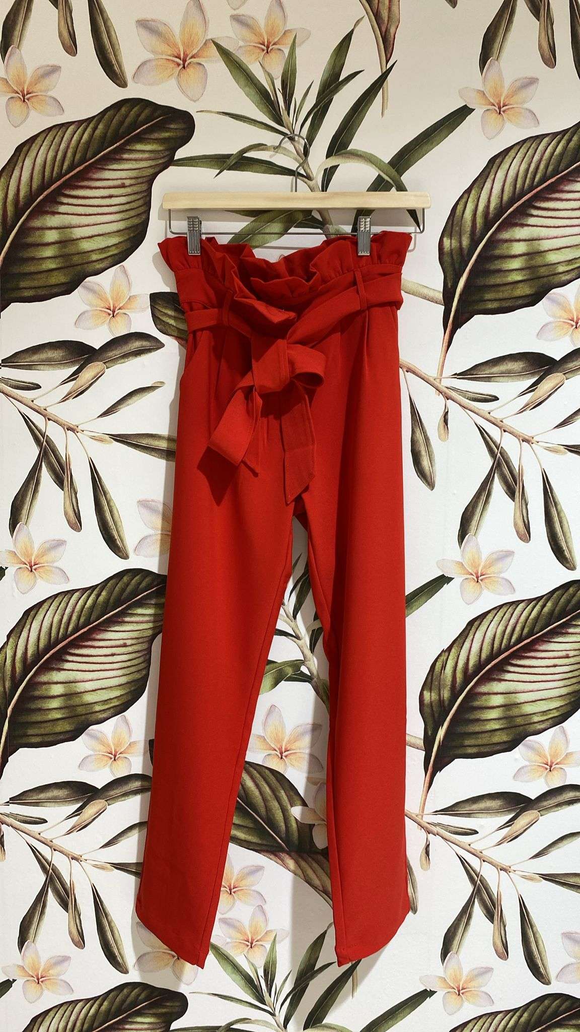 Elegancia y estilo en una sola prenda. Este pantalón de vestir en un vibrante color rojo cuenta con un diseño de tiro alto y cinturón ajustable que realza tu figura. Su corte favorecedor y tejido cómodo lo hacen ideal tanto para looks formales como para ocasiones especiales. Disponible en tallas de la S a la XL.