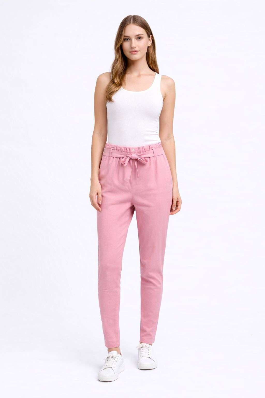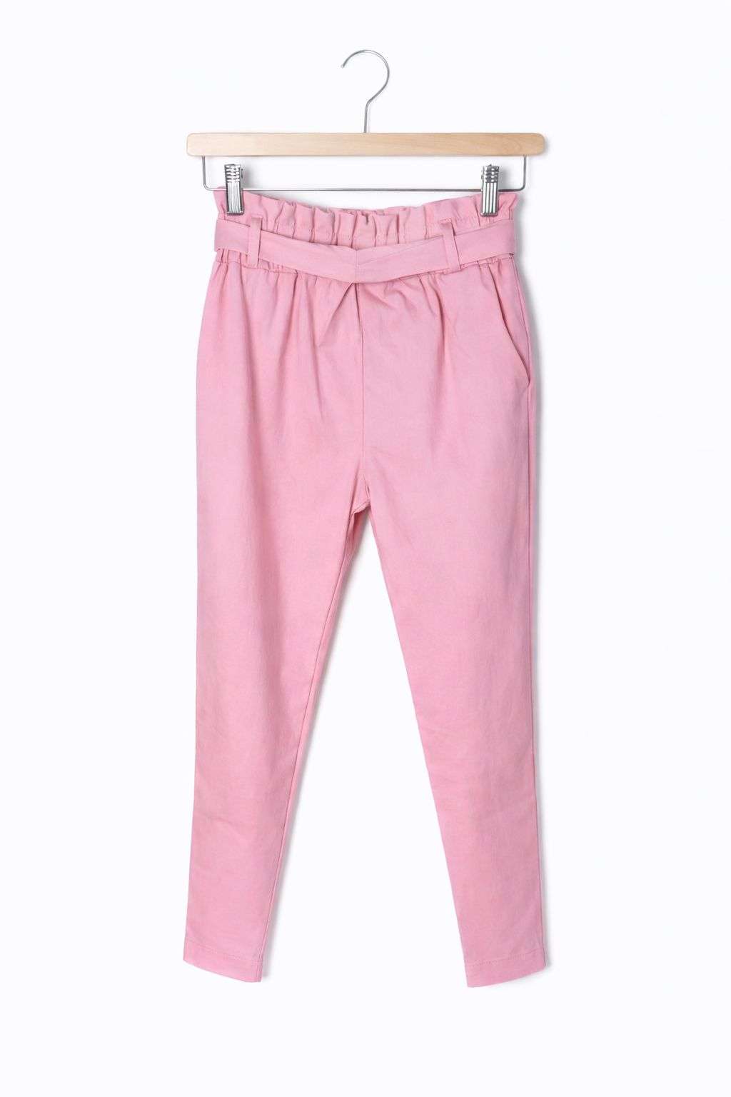 Pantalón paperbag de mujer en color rosa empolvado, ideal para crear looks femeninos y actuales. Diseñado con cintura alta elástica tipo paperbag y cinturón a juego, que realza la silueta y aporta un ajuste cómodo y favorecedor.