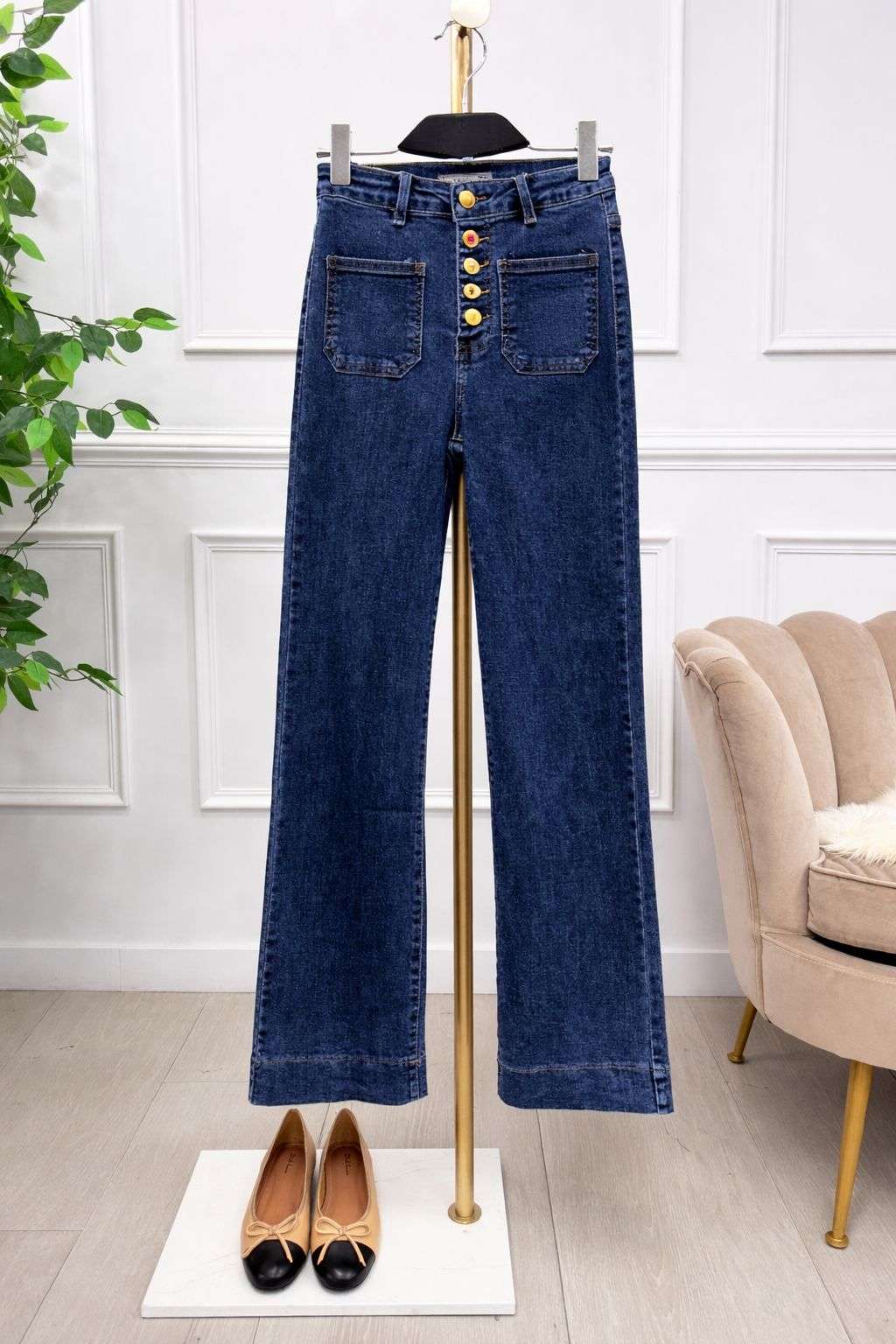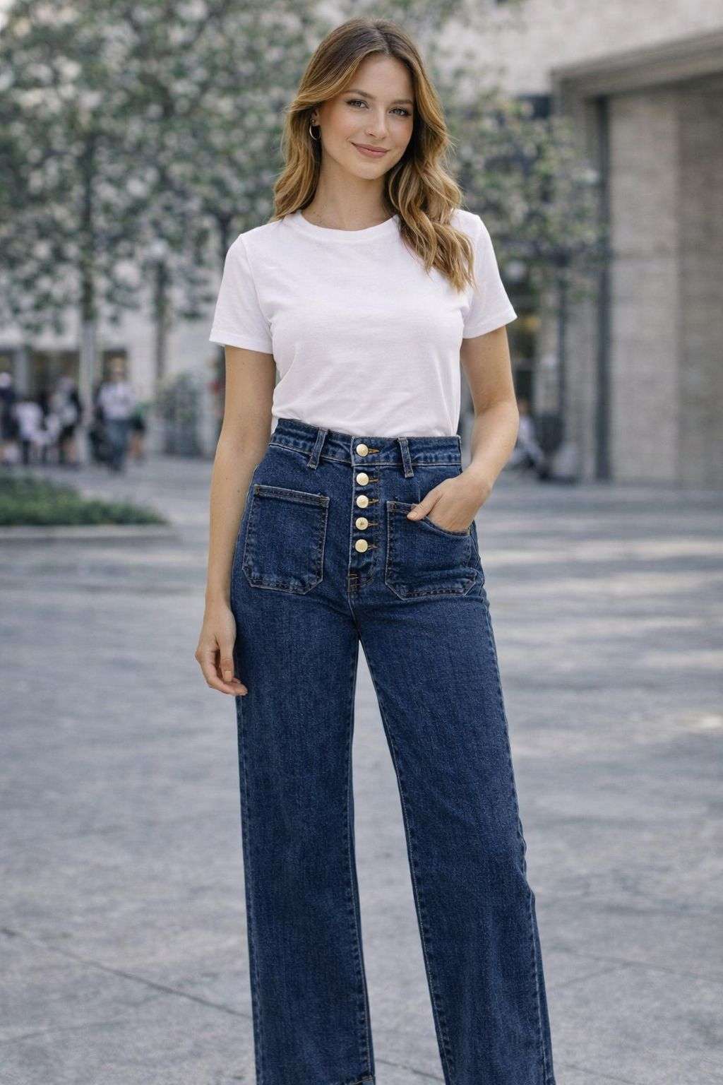 Vaquero de tiro alto y pernera ancha, con cierre de botones y bolsillos frontales. Un diseño cómodo y favorecedor que estiliza la silueta y combina fácilmente con cualquier look diario.