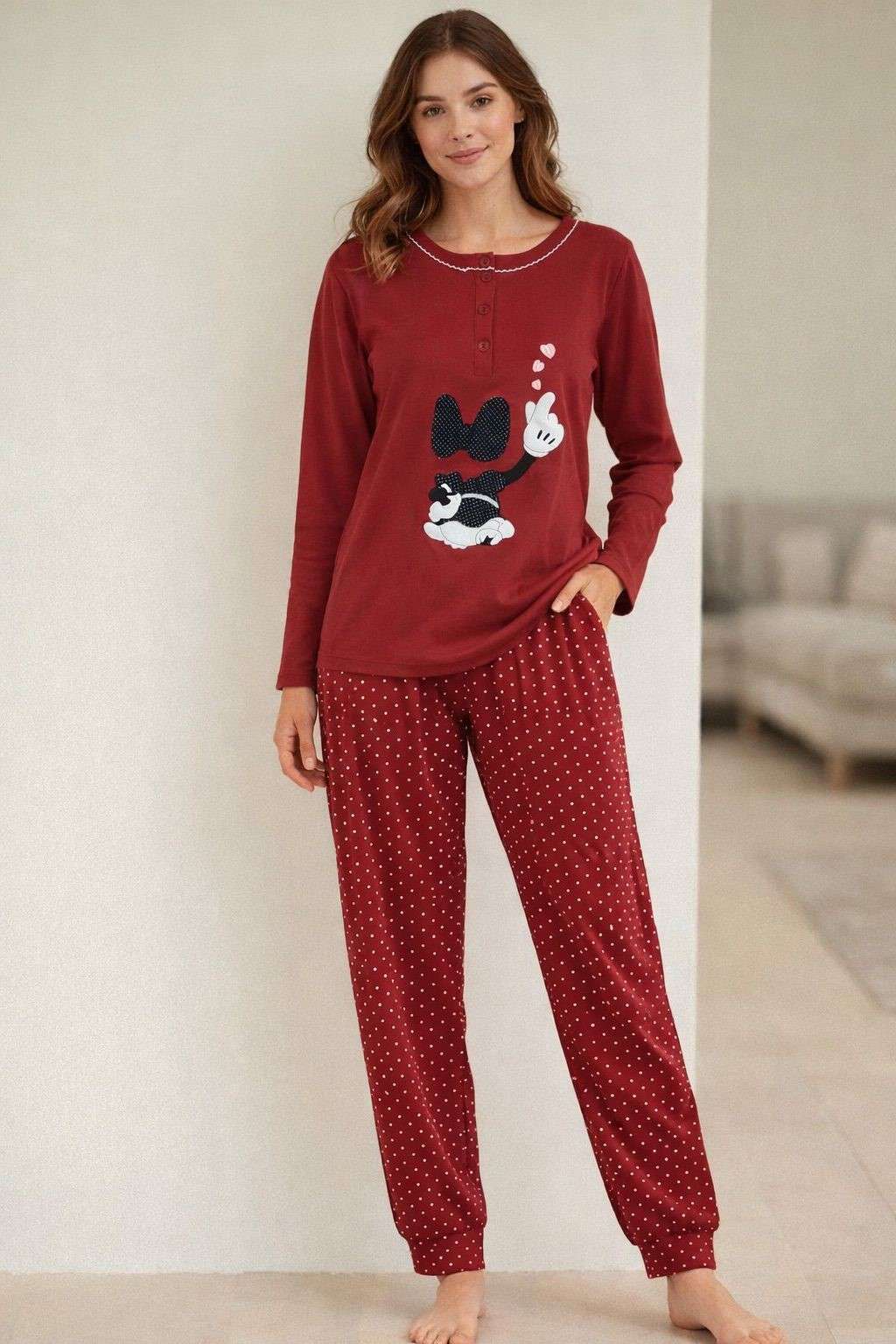 Pijama largo de mujer con camiseta de manga larga, cuello con botones y estampado divertido en el frontal. Pantalón largo de lunares a juego con ajuste cómodo. Tejido suave y agradable, ideal para descansar con estilo y confort.