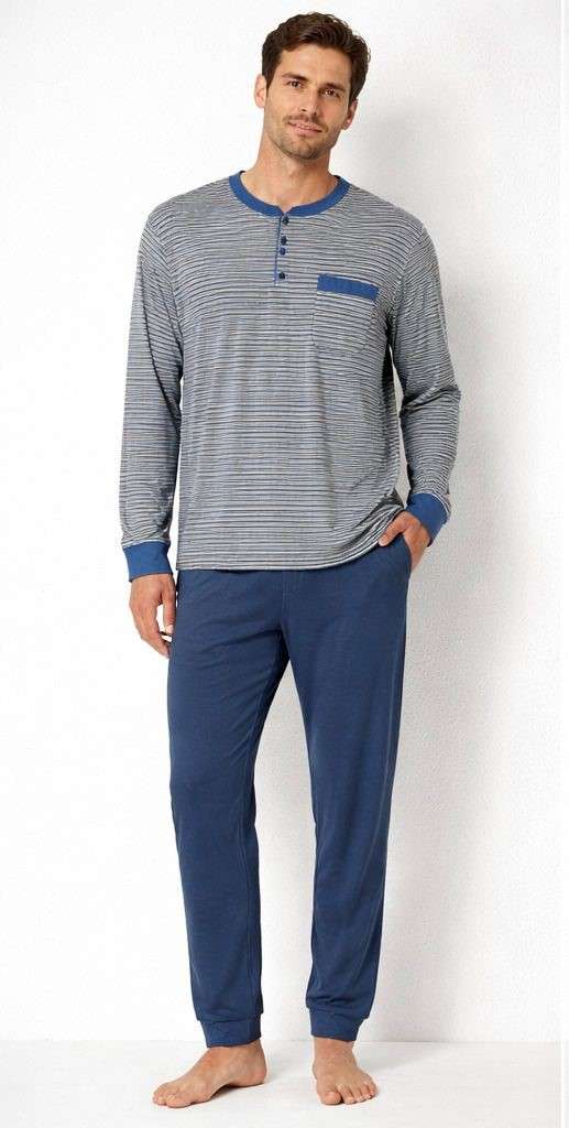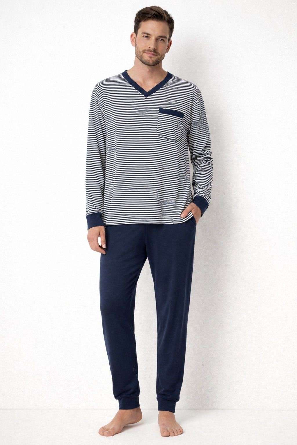 Pijama largo de hombre con camiseta de manga larga a rayas, cuello con botones y pantalón liso a juego. Confeccionado en tejido suave y cómodo, perfecto para el descanso diario y para disfrutar de noches confortables sin renunciar al estilo.