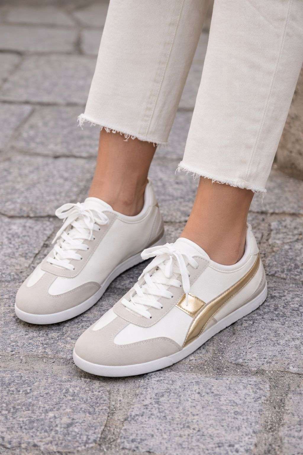 Zapatillas de estilo casual en tonos blanco y beige con detalle dorado lateral. Cómodas, ligeras y fáciles de combinar, ideales para el día a día con un toque elegante.